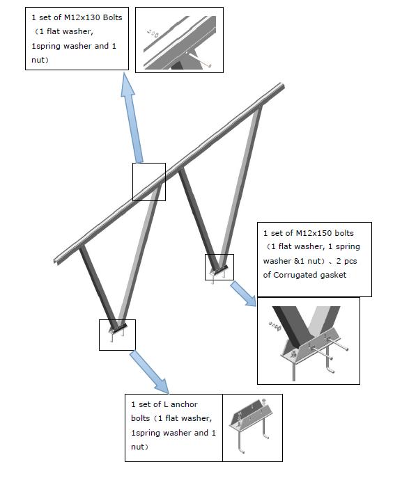 注:取り付け構造の組み立て済みボルトは完全にロックされていないため、現場での設置時の調整に便利です.取り付け後、すべてのボルトがロックされていることを確認してください.