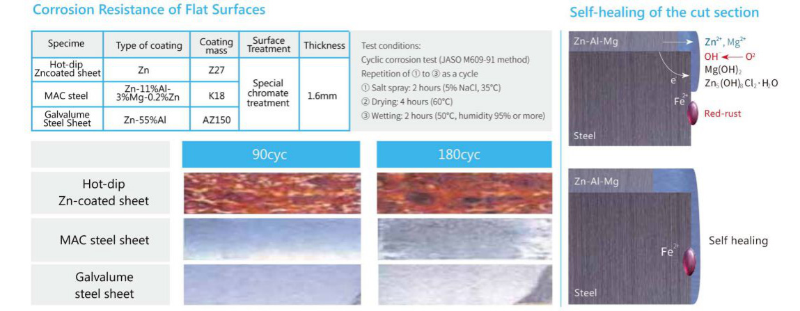 Mac鋼は高温からなる。亜鉛(Zn)、アルミニウム (AL) マグネシウム (Mg)。 マグネシウム (MG) コーティング中の成分は、非常に安定したものおよび構造化された構造の形成を促進するのに有益である。微保護膜、MAC鋼は優れた耐食性を有する。